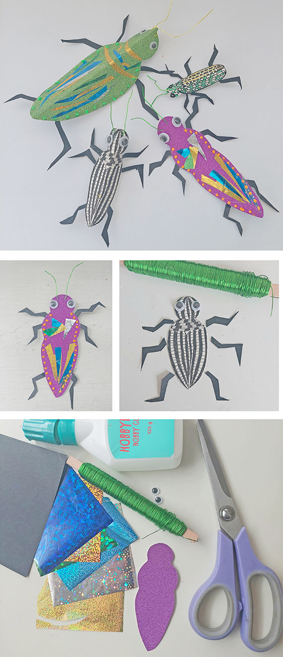 När du dekorerat klart klistrar du på ögon och gör känselspröt av tex ståltråd som du trår igenom huvudet. Benen klipper du ut i svart papper och klistrar fast. Sist viker du insekten på mitten så att den blir lite bullig och kan stå.